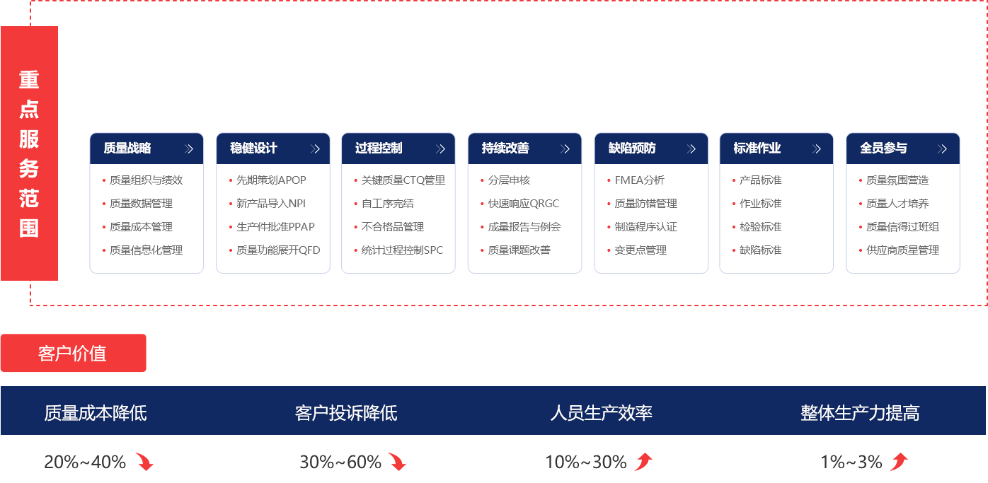 - “精益質量咨詢”是快速搭建零缺陷質量文化體系,突破多種管理體系并存,碎片化,落地難,“部門墻”嚴重,